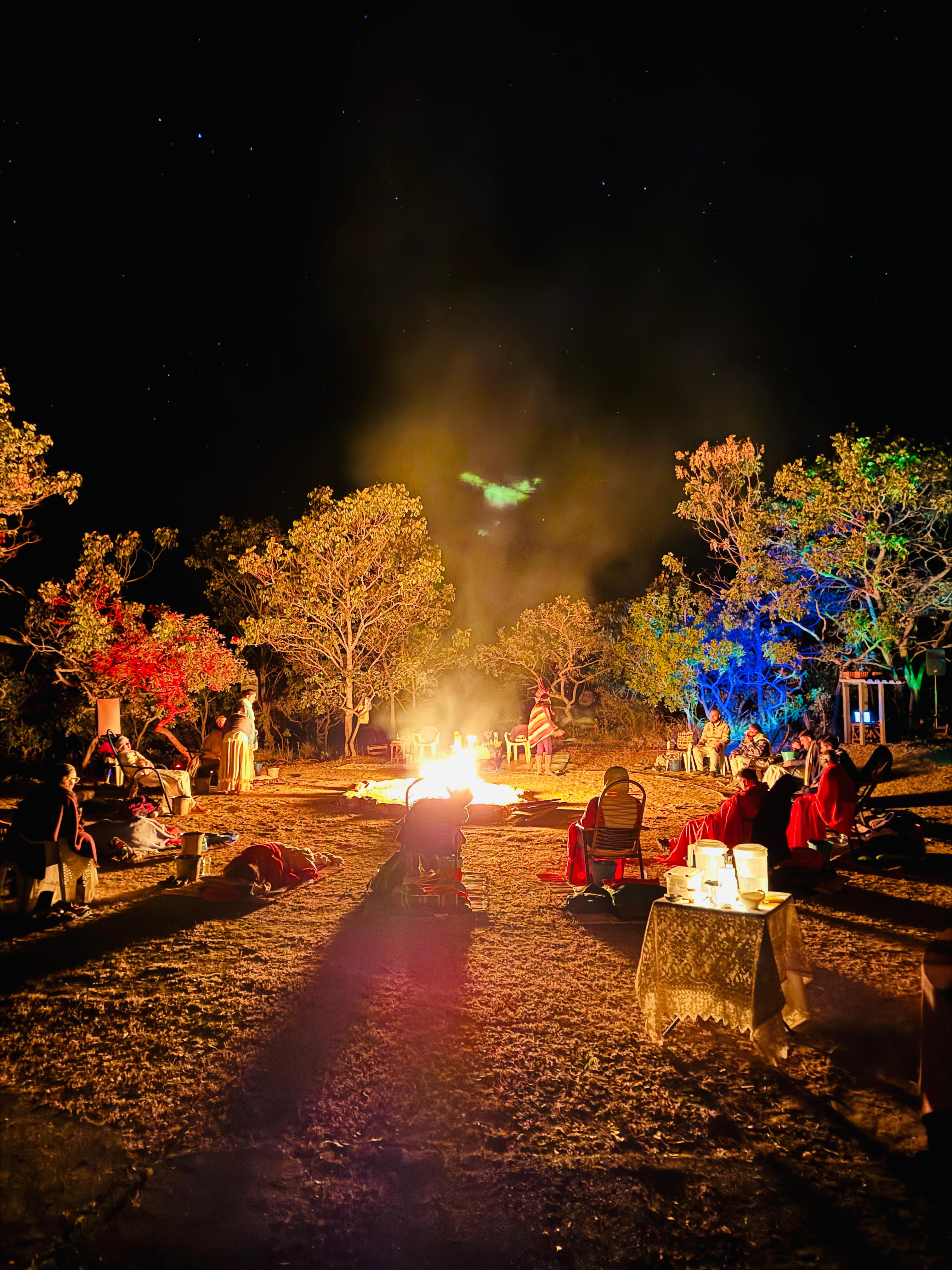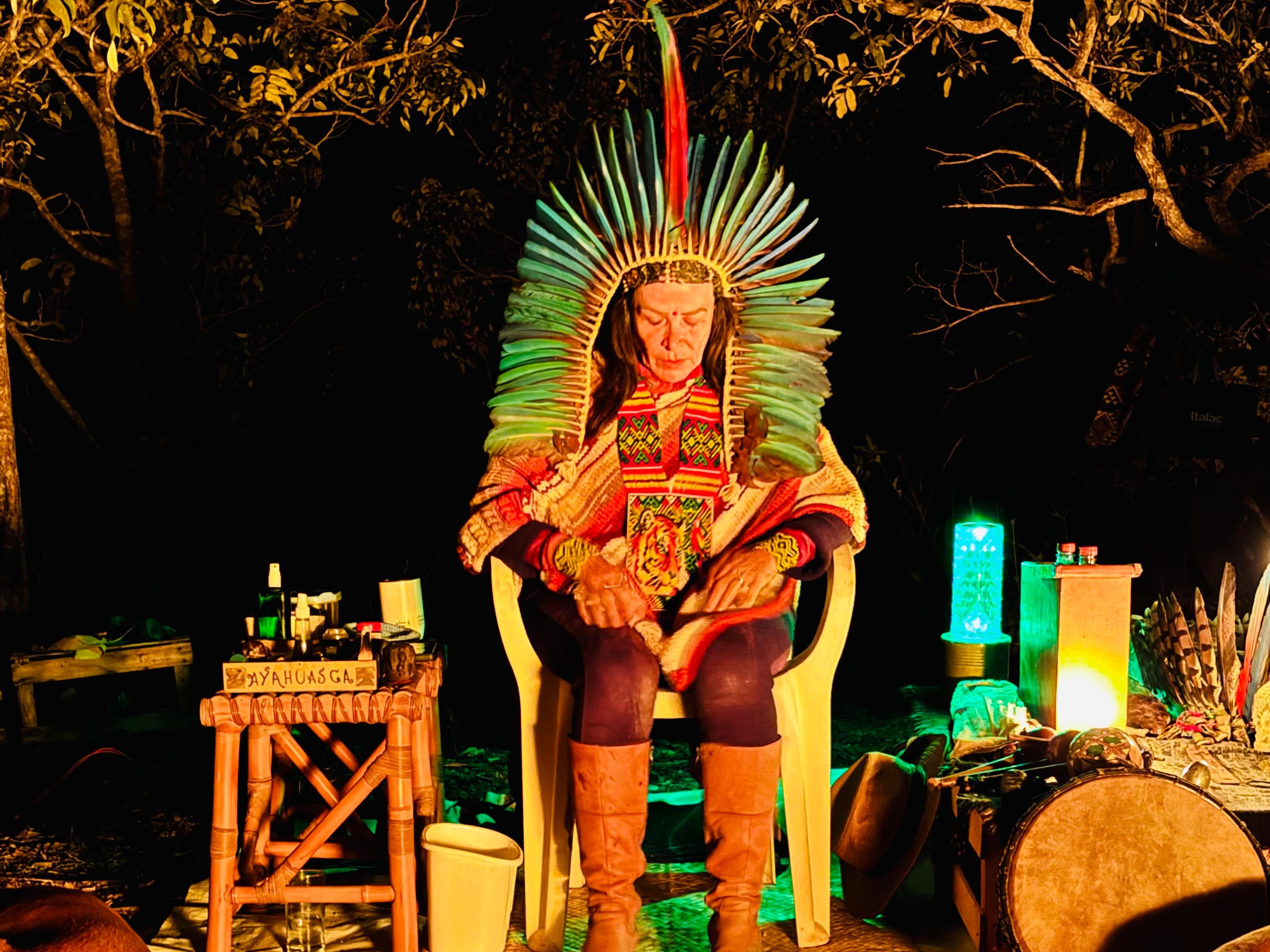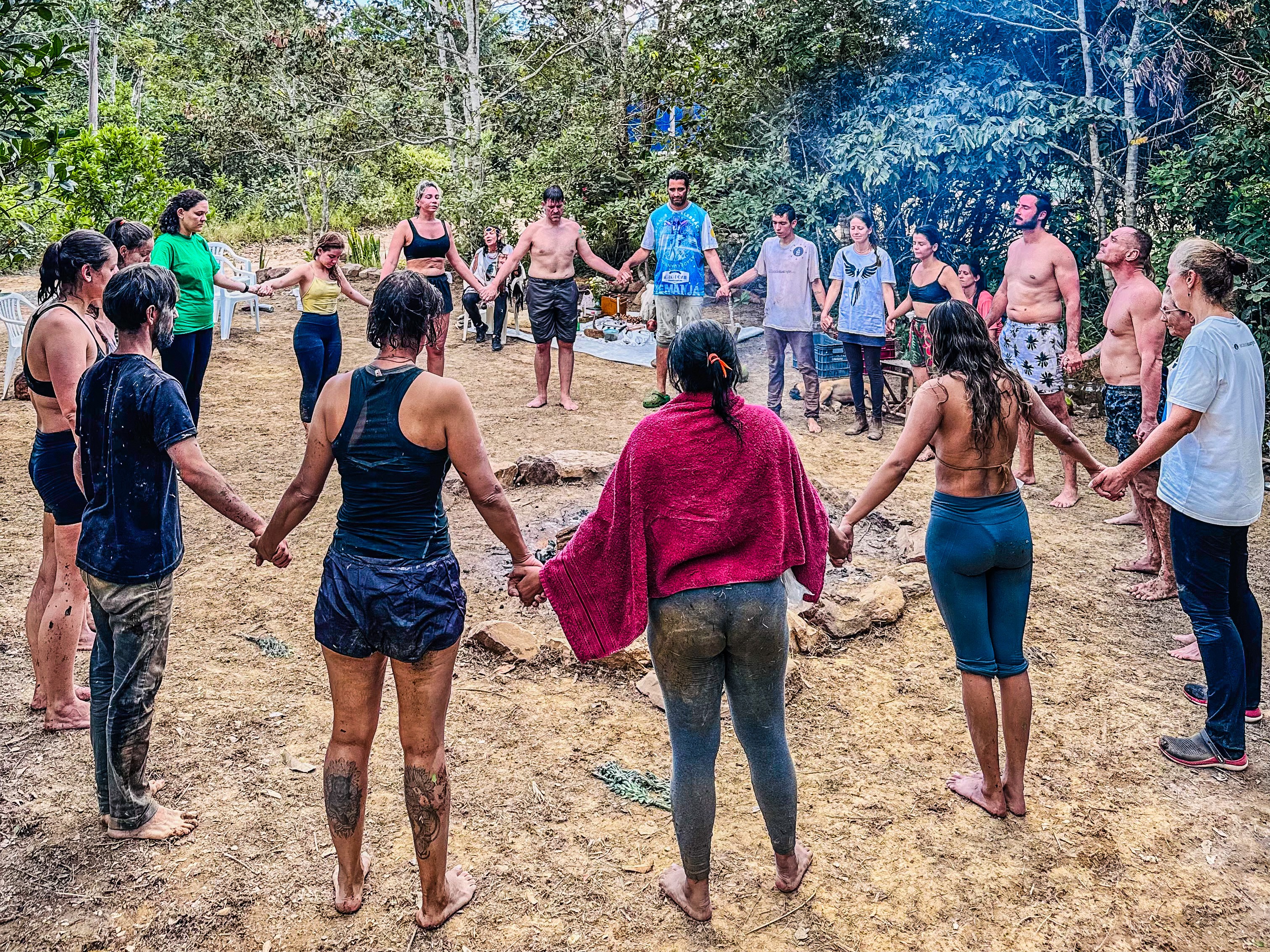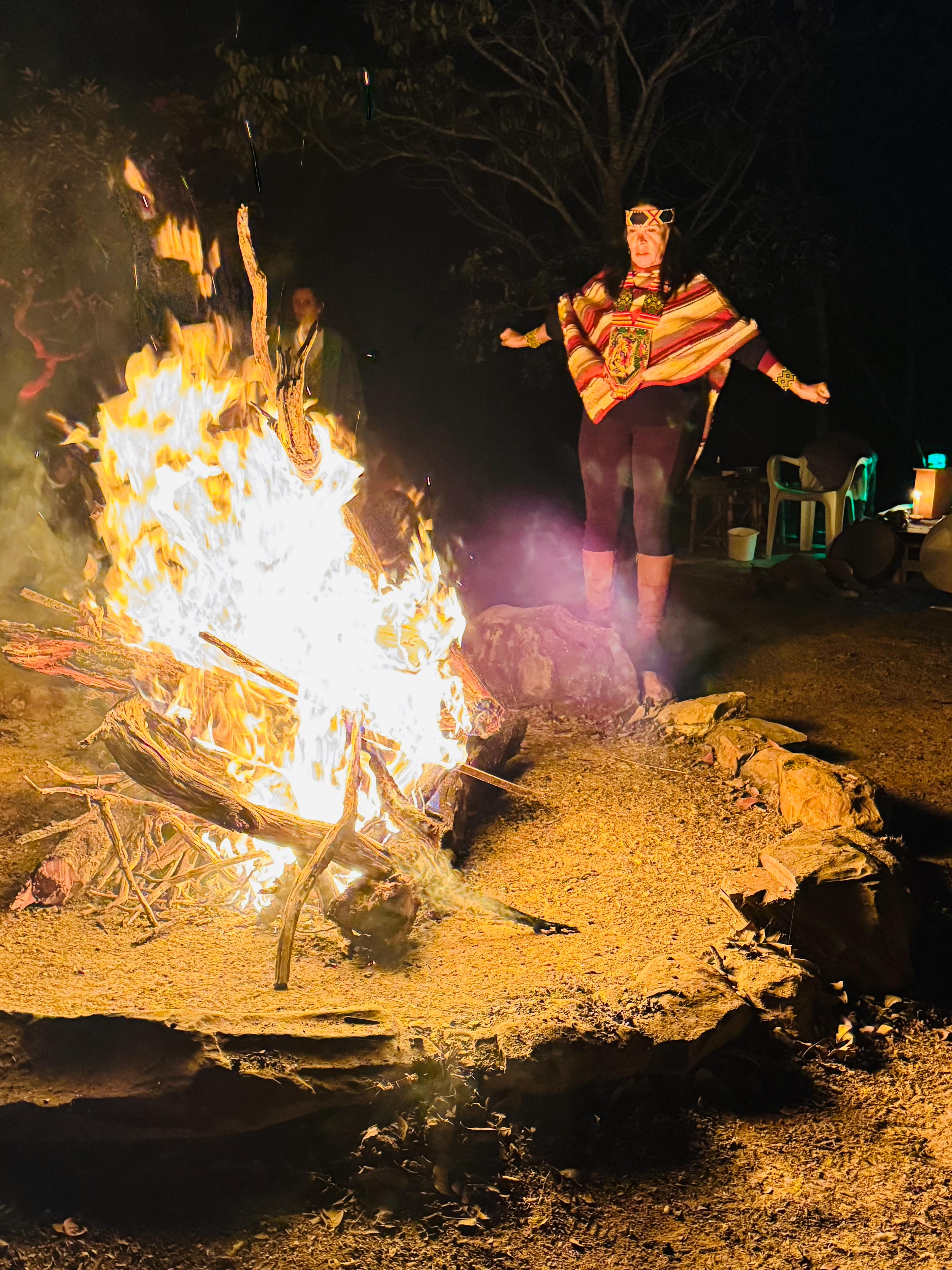 Cerimônia de Fogo Sagrado + Ayahuasca (opcional) + Rapé. Entrega simbólica de medos e culpas aos antepassados, transformando o "fardo" em "força".